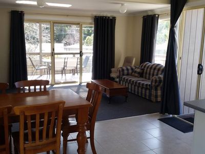 Tiled flooring in kitchen, wet areas and dining room.
